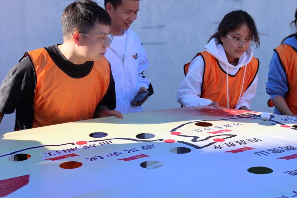天朗气清,惠风和畅。全体师生随机分为6组,每组以最快的速度“集结队伍”,确定队名、口号等。在“重走长征路”项目,主持人在红军长征路线图前为大家生动讲解了红军长征故事,回顾长征历史。为了加深大家对红军长征路线图的记忆,每个队伍借助网球,从江西瑞金出发,依次经过长征途中的重要地点,最后抵达陕西延安,感受红军战士们长征中不畏艰难险阻、团结合作的伟大精神。